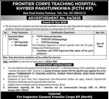 Candidates if you are seeking Frontier Corps Teaching Hospital Jobs In Kpk November 2025 if yes. It would be best if you tried to complete read Frontier Corps Teaching Hospital job because you can easily apply for these vacancies Specialist (Male) (Full Time) ENT Specialist  Dermatologist.