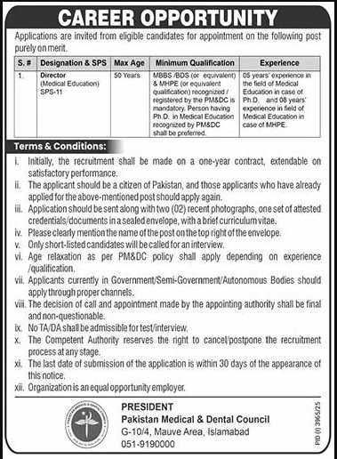 Candidates if you are seeking Pakistan Medical And Dental Council Jobs In Islamabad November 2025 if yes. It would be best if you tried to complete read Pakistan Medical And Dental Council job because you can easily apply for these vacancies Director (Medical Education) SPS-11.