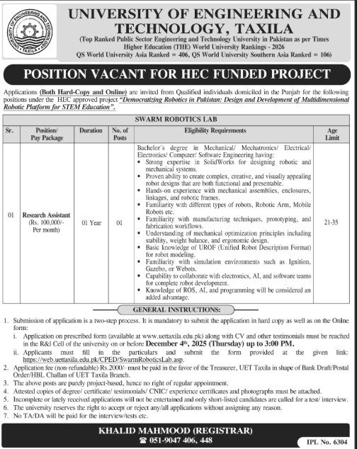 Candidates if you are seeking University Of Engineering And Technology Taxila Jobs In Pakistan November 2025 if yes. It would be best if you tried to complete read Engineering And Technology Taxila job because you can easily apply for these vacancies Research Assistant (Rs. 100,000/-Per month).
